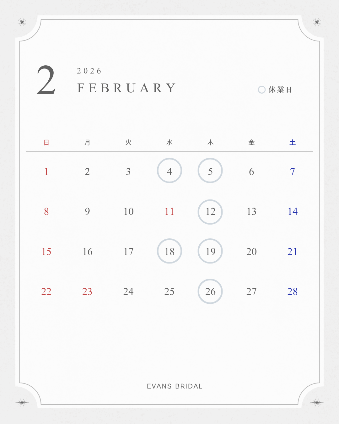 ◆2026年2月は下記の日程で休業させていただきます。