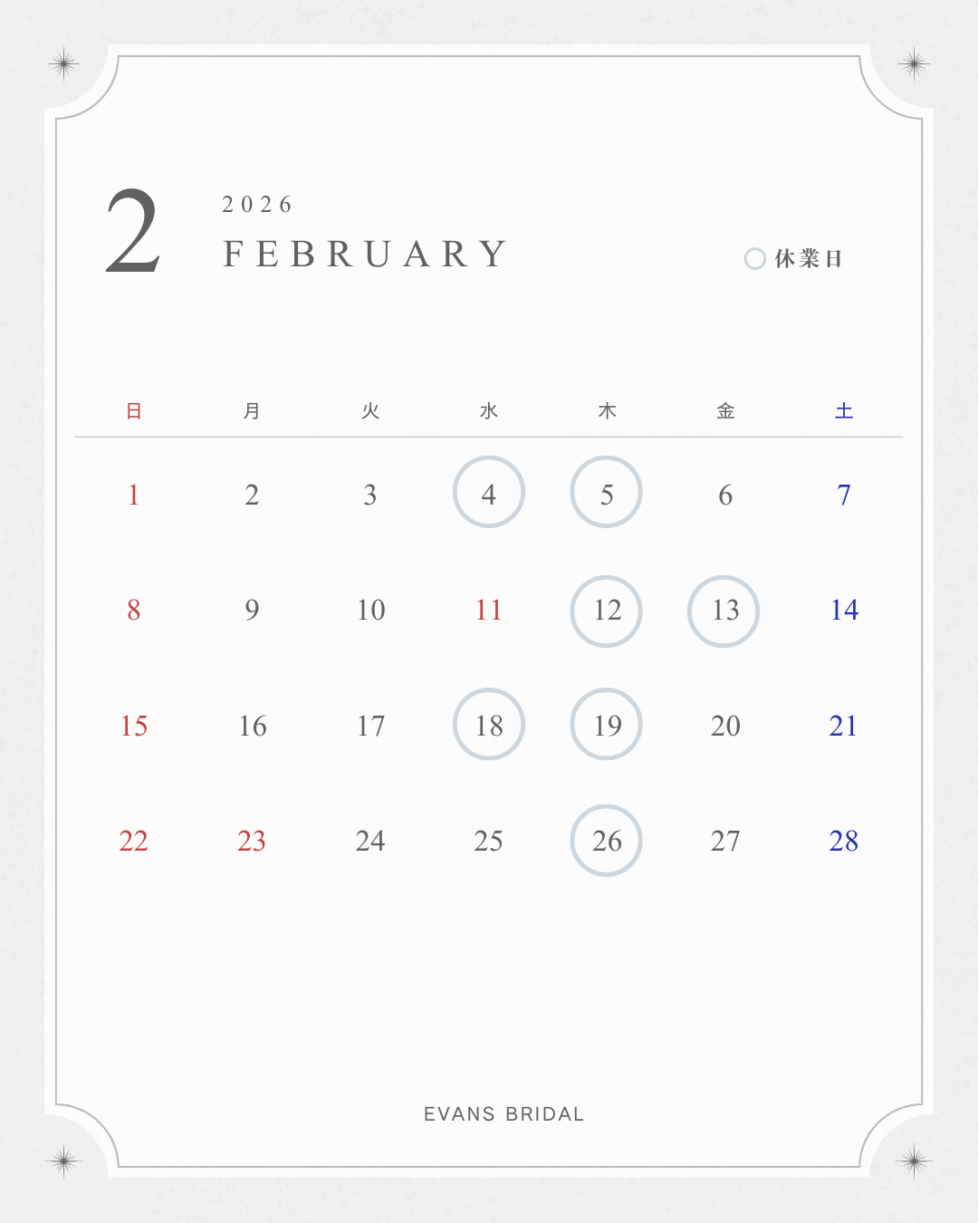 ◆2026年2月は下記の日程で休業させていただきます。